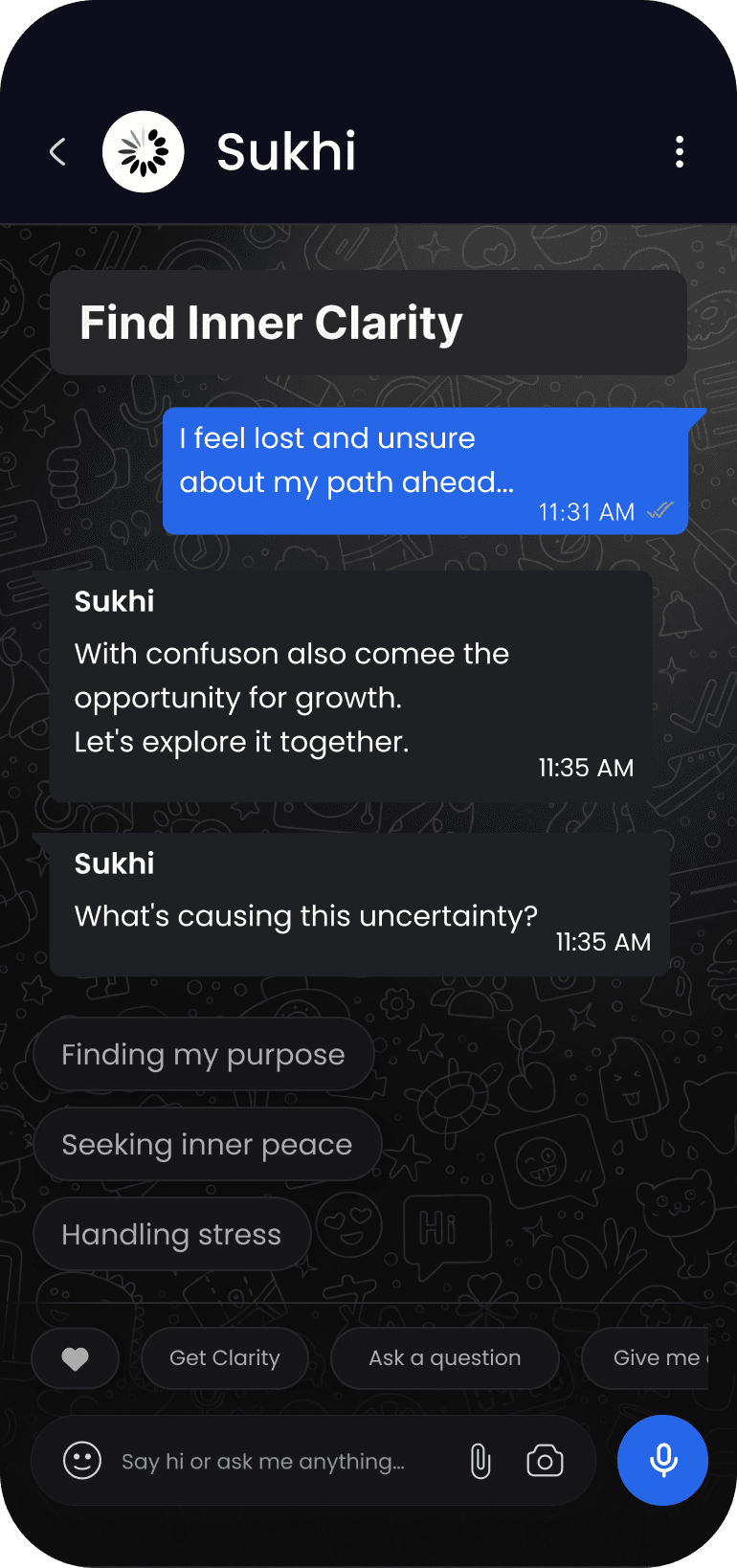 Whether life feels overwhelming, you’re stuck in self-doubt, or simply in need of a caring presence, Sukhi walks beside you—offering clarity, motivation, and friendship.
