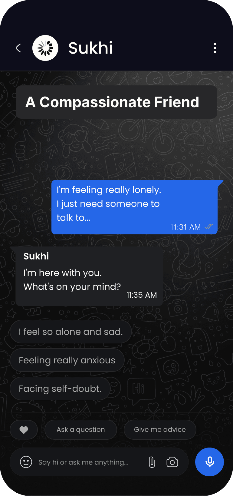 Sukhi is an emotionally intelligent conversational AI designed to: